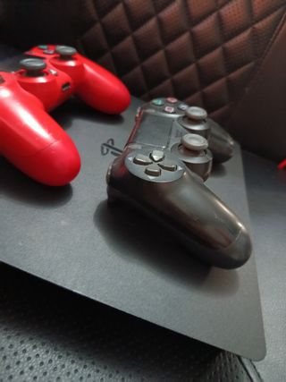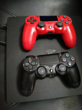 Dos mandos para PlayStation 4 Slim en perfecto estado. Uno es de color negro y el otro rojo. Se incluyen los dos mandos. - Modelo PS4 Slim. - Capacidad de 860 GB. - Incluye dos mandos.