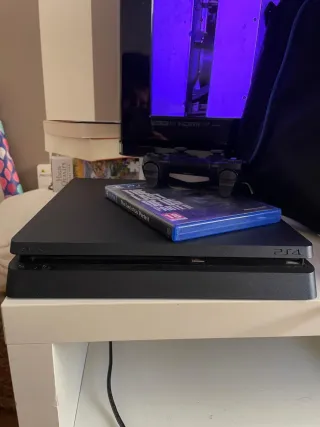 PlayStation 4 Slim en perfecto estado, lista para disfrutar de tus juegos favoritos. Incluye dos mandos, uno rojo y otro negro. - Consola en excelentes condiciones. - Dos mandos incluidos.