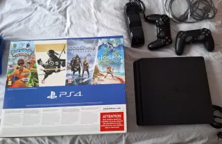 PS4 1TB, sin cable HDMI. Incluye base de refrigeración con carga para dos mandos y 8 juegos (NBA 2K17, COD Modern Warfare, Days Gone (vendido), Battlefield 1, COD WW2, RDR2, NFS Payback y Riders Republic). El 2K17 está en otro anuncio de mi perfil, pero se incluye en el pack