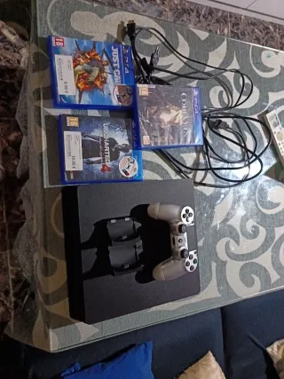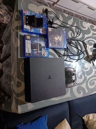 Consola PlayStation 4 slim 1 tb en color negro. - Diseño compacto y elegante. - Superficie lisa y mate. - 3 mandos 1 no original. - Todos los cables incluidos. - Soporte vertical con ventiladores. - Auriculares por cable. - Tengo la caja original.