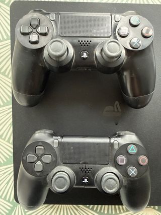 PlayStation 4 en buen estado, lista para usar. Incluye dos mandos originales, uno blanco y otro negro. - Perfecta para jugar tus videojuegos favoritos. - Mandos en excelentes condiciones. - Consola en muy buen estado.