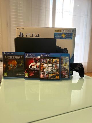 PlayStation 4 Slim en color negro 500GB. Está en muy buen estado. Incluye: - PS4 (la consola). - Cable HDMI (de consola a monitor). - Mando Dualshock 4. - Cable de carga del mando. - Cable rojo de Red Wifi LAN. - Videojuego Grand Theft Auto 5 (GTAV). Perfecta para jugar tus videojuegos favoritos.
