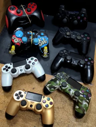 Lote de mandos para consolas. -2 mandos PS2 -2 mandos PS3 -4 mandos PS4 2 Originales y 2 marca Blanca. - Mando Maverick negro y rojo. - Mando Sony negro con logo. - Mando Sony negro. - Mando blanco y negro. - Mando dorado y negro. - Mando camuflaje.