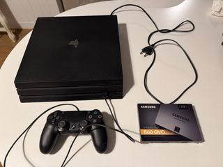 Consola PlayStation 4 Pro en color negro con disco de estado sólido (SSD) de 1TB. - Incluye consola PS4 Pro con caja original - Disco de estado sólido (SSD) Samsung 860 QVO de 1TB. - 1TB HDD original (en caja de Samsung) - Mando DualShock 4. - Cable de alimentación. - Cable de carga
