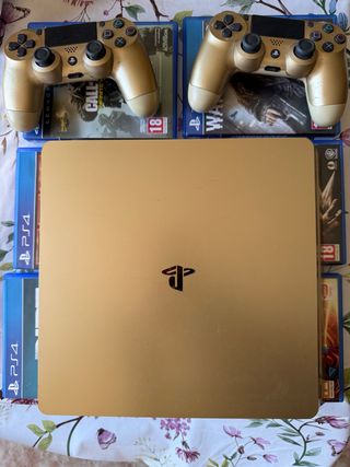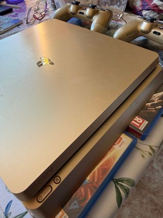 Consola PlayStation 4 Slim en acabado dorado, con dos mandos uno va bien creo que el la botón cuadro - Modelo Slim. - Versión de software 11.02. Ps5, ps4 pro, ps5 slim, gaming, pc, silla, mesas, smart, iphone