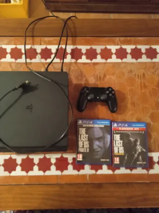 Consola PlayStation 4 Slim de 1TB con dos mandos originales y un cargador. - PlayStation 4 con memoria de 1 TB. - Dos mandos DualShock 4 originales, funcionan perfecto. - Base cargadora para dos mandos. - 3 juegos. The Last of Us, Uncharted 4, Ratchet Clank