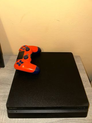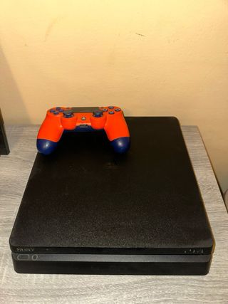 Consola Playstation 4 con disco duro de 1 TB y mando. - Mando de color naranja y azul. - Consola de color negro.
