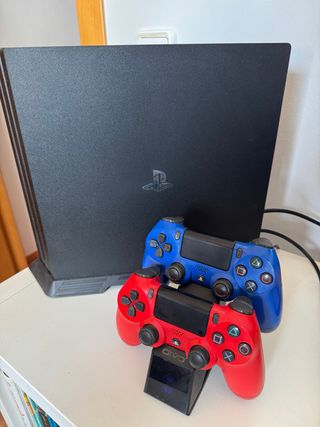 PlayStation 4 Pro de 1TB en perfecto estado, con dos mandos: uno azul y otro rojo. Están en muy buen estado. - Incluye consola PlayStation 4 Pro de 1TB. - Dos mandos inalámbricos DualShock 4. - Uno de los mandos es azul y el otro rojo. - pie orizontal - cargador mandos inalabrico