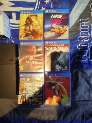 Consola PlayStation 4 en color negro, junto con una selección de cinco videojuegos. - Incluye mando DualShock 4. - Juegos: Mortal Kombat 11, NFS, FIFA 20, Watch Dogs, Grand Theft Auto V, Dragon Ball Z: Kakarot.