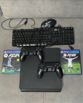 Consola PlayStation 4 en color negro, en excelente estado. - Incluye un mando dualsock 4 (lloystick un poco lagueado - Incluye los juegos FC 24 y FC 25. - raton y teclado NO INCLUIDO
