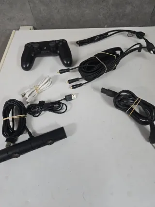 Lote de accesorios para PlayStation 4. - Mando DualShock 4 negro. - Cámara PlayStation. - Cables de carga y conexión.