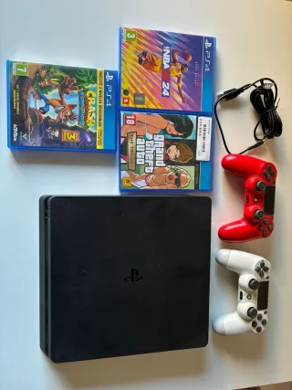 Consola PlayStation 4 en color negro. Modelo Slim 500gb. La entrego con el cable HDMI y el cable del cargador del mando, 2 mandos uno rojo y el otro blanco. 3 juegos ( Crash Bandicoot, GTA trilogy , nba 2k24 edition kobe Bryant). La consola está en perfecto estado , funciona correctamente, no tiene dañado nada , ningún arañazo etc.