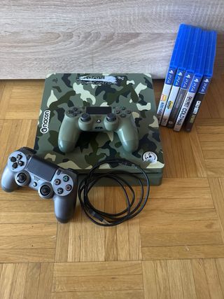 PS4 con 2 mandos y 5 juegos. La tengo desde hace 4 años pero no tiene apenas uso, está en perfectas condiciones sin ningún arañazo ni desperfecto. Funciona perfectamente y está actualizada, trae cable HDMI y de corriente y tiene capacidad de 1 Tb. Incluyo 2 mandos que funcionan perfectamente tanto joycons como touch pad más sus respectivos cables de carga. Y por último los 5 juegos originales con sus cajas y los discos como nuevos. SE VENDE TODO JUNTO POR 240€. Se hacen envíos. Ya no tengo la caja, es solo una foto