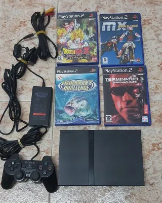 Consola PlayStation 2 Slim en color negro, lente nueva. con mando y cables. - Incluye los siguientes juegos: - Max Payne - Terminator 3: Rise of the Machines - MX World Tour - Fisherman's Challenge