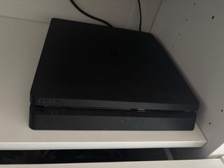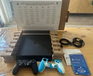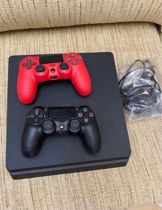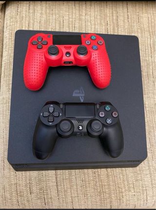 PlayStation 4 slim en excelentes condiciones, lista para usarse. Incluye dos mandos: uno negro y otro rojo con funda de silicona. - Consola en perfecto estado. - Dos mandos incluidos. - Uno de los mandos tiene una funda roja. - Todos los cables