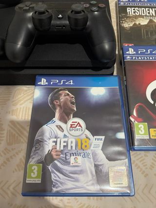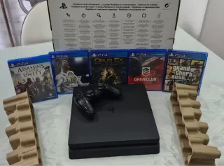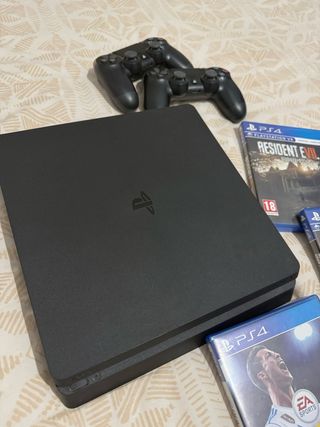 Ps4 slim de 500 gb Acompañada de dos mandos en muy buen estado y 4 juegos en muy buen estado poco uso a los juegos Cualquier consulta aquí me tenéis Pequeño ruino en la disquera, No afecta a nada en la play tan solo dura un minuto al introducir el disco