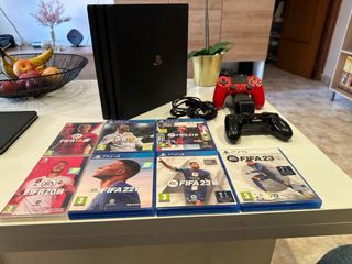Consola PlayStation 4 Pro en color negro, con dos mandos y juegos de FIFA. - Incluye consola PS4 Pro. - Dos mandos DualShock 4 (negro y rojo). - Juegos: FIFA 18 / 21 / 22 / 23 (PS4) FIFA 23 (PS5) FIFA 18 / 20 (NINTENDO SWITCH)