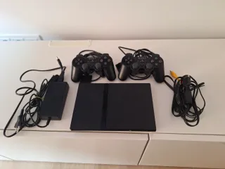 Consola PlayStation 2 Slim en color negro, junto con accesorios y juegos. - Consola PlayStation 2 Slim. - 4 mandos (2 negros, 1 amarillo, 1 verde) los 2 negros enciende la luz pero no funcionan. - 8 juegos: Gran Turismo 4, Señor de los Anillos, Resident Evil 4, God of War, Grand Theft Auto, PS2 Classics Volume One, God of War II, Urbz. - Cables de conexión y adaptador de corriente.
