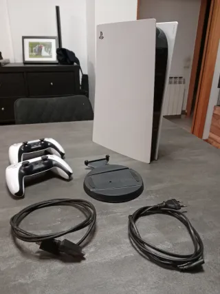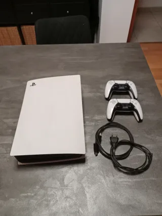 La vendo por necesidad por lo que no puedo aceptar menos de 350€. PlayStation 5 con disco duro de 1TB y dos mandos DualSense. - Versión digital. (Sin lector de cd's) - Dos mandos. - Cable de alimentación y HDMI. - No incluye caja. Uno de los mandos es nuevo, el otro funciona bien pero tiene los joysticks pelados.