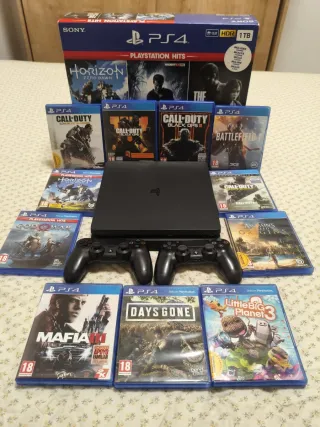 Consola PlayStation 4 Slim en color negro con 1TB de almacenamiento. Incluye dos mandos DualShock 4. Y 11 Juegos. Se entrega con Caja y su Cableado. - Capacidad de 1TB. - Dos mandos inalámbricos. - Diseño compacto y ligero.