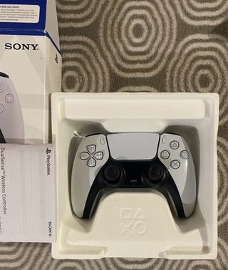 Mando inalámbrico DualSense para PlayStation 5. Está en perfecto estado, sin apenas uso. La caja esta algo dañada como se puede ver en las fotos - Diseño ergonómico en blanco y negro. - Puerto de carga y conexión para auriculares.