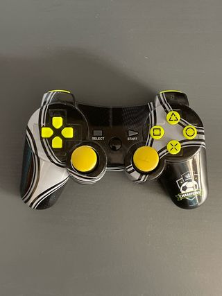 Mando Dualshock para PlayStation 3 con un diseño único y llamativo. - Diseño personalizado con motivos de fútbol y Champions. - Botones y joysticks en color amarillo brillante. - Acabado principal en negro con detalles plateados y blancos.