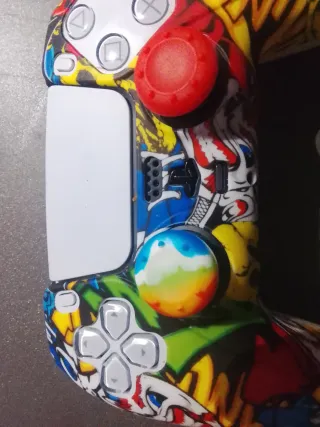 Mando original de PlayStation 5 con un diseño único y llamativo. - Funda personalizada con estilo graffiti. - Incluye todos los botones y joysticks originales.