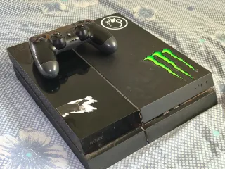 Consola PlayStation 4 pro ultra en color negro. Este modelo cuenta con un diseño elegante y compacto. Incluido mando y 7 juegos (pack) - Incluye pegatinas personalizadas: dos logos de Apple, un logo de Monster Energy y un logo de PlayStation. - Adicionalmente, tiene una pegatina de Not For Sale y otra con un diseño de Monkey King. El precio es negociable.