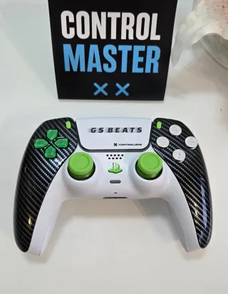 Mando de PS5 con un diseño único y llamativo. - Carcasa con acabado en fibra de carbono. - Detalles en color verde vibrante. - Botones frontales y analógicos en verde. - Parte superior blanca con logo GS BEATS.