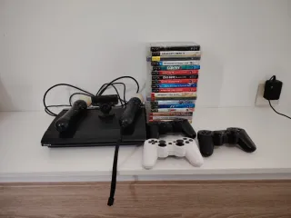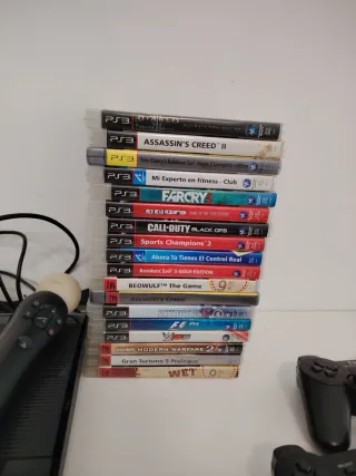 Se vende lote completo de PlayStation 3. - Consola PlayStation 3. - Cámara PlayStation Eye. - 2 mandos de movimiento. - 3 mandos DualShock 3. - 18 juegos: Assassin's Creed II, Tom Clancy's Splinter Cell: Conviction, Mi Experto en Fitness - Club, Far Cry 2, Call of Duty: Black Ops, Sports Champions 2, Ahora Tú Tienes El Control Real, Resident Evil 5 Gold Edition, Beowulf: The Game, Assassin's Creed, F.E.A.R., F.E.A.R. 2: Project Origin, Call of Duty: Modern Warfare 2, Gran Turismo 5 Prologue.