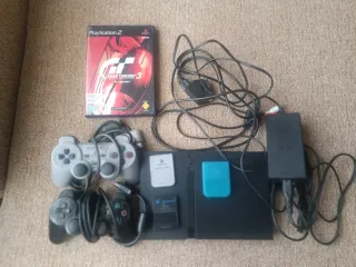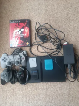 Consola PlayStation 2 modelo Slim en color negro. Incluye varios accesorios para disfrutar de tus juegos.Lo mando en la caja de la PS2 fat para que quepa bien todo(Per es la slim). - Mando DualShock 2 gris. - Mando DualShock 2 negro. -3 Tarjetas de memoria. - Cableado y adaptadores. - Juego Gran Turismo 3 A-Spec. -La consola y los mandos funcionan perfectamente y están en buen estado. -Regalo también algunos juegos ((Consultar).