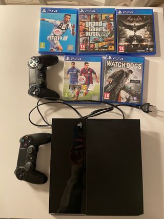 Consola PlayStation 4 de 500GB en color negro, junto con dos mandos DualShock 4 y cinco videojuegos. - Juegos incluidos: FIFA 19, Grand Theft Auto V, Batman: Arkham Knight, FIFA 15 y Watch Dogs. - Dos mandos inalámbricos. - Cable de alimentación.