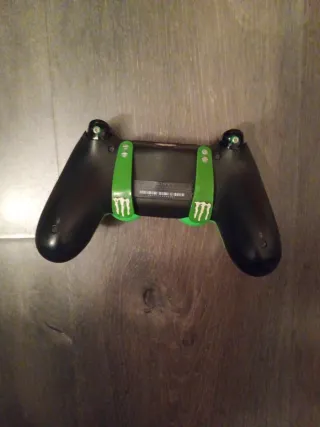 Mando de PS4 con un diseño personalizado en color verde y el logo de Monster Energy. - Diseño llamativo. - Botones en color dorado.