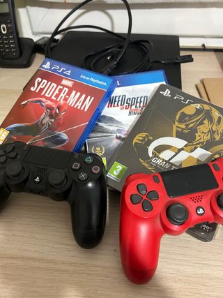 Lote de videojuegos para PlayStation 4. - Marvel's Spider-Man - Need for Speed Rivals - Gran Turismo Sport - Incluye dos mandos DualShock 4 (uno negro y uno rojo).