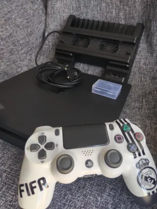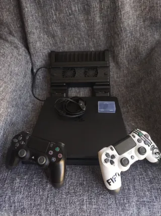 Consola PlayStation 4 Slim de 500GB con accesorios. - Incluye base de refrigeración con ventiladores. - Dos mandos DualShock 4 (uno negro y otro blanco personalizado). - Soporte para juegos.