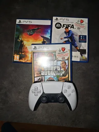 Lote de tres videojuegos para PlayStation 5. - FIFA - Grand Theft Auto V - Final Fantasy VII Remake - Incluye mando DualSense blanco.