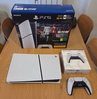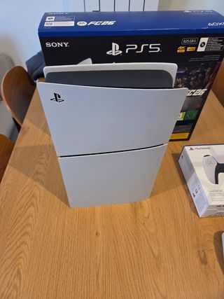 Consola PlayStation 5 Digital Edition con 825GB de almacenamiento y dos mandos DualSense. Uno de los mandos está todavía sin abrir. Comprada el 25/11/2025, por lo que tiene todavía casi los 3 años de garantía completos (entrego ticket). No tiene ni 5 horas de uso, por eso la vendo. - Incluye consola PS5 Digital Edition. - Dos mandos inalámbricos DualSense. - Capacidad de 825GB. Aunque me vino con el FC26, el juego NO ESTÁ INCLUIDO, por ser digital e ir asociado a mi cuenta.