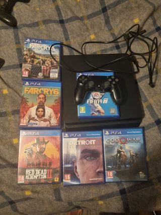 Consola PlayStation 4 en color negro, lista para horas de entretenimiento. - Incluye dos mandos inalámbricos. - Cuatro videojuegos: Fallout 4, FC 24, Uncharted 4 y NBA 2K21. - Cables de conexión necesarios. Cable HDMI cable de corriente y cable para cargar los mandos mando con led cambia de colores dispongo de más mandos nuevos a 22€ y más juegos de ps4 consolas varias play 1 play 2 ps3 ps4 Xbox one Xbox 360 todas con mando y juegos preguntar móviles desde 40€ redmi 9 remid 13 Huawei p10 redmi 9 de 64 de almacenamiento por 60€