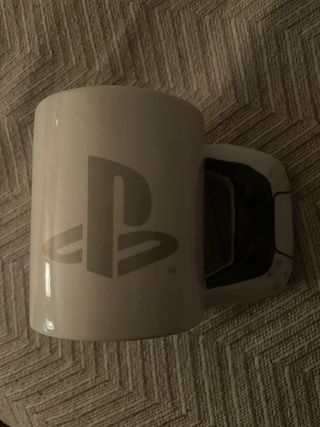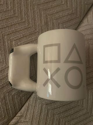 Taza blanca con el logo de PlayStation. - Diseño icónico de PS. - Asa con detalles inspirados en el mando DualSense.