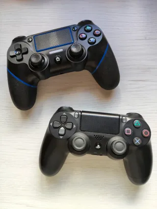 Pack de dos mandos negros compatibles con PlayStation 4 y PC. - Mando Sony PS4 original con poco uso y sin golpes. Ha pasado perfectamente el control de calidad para revender. -Mando Nuwa negro con tonos azules para PS4 también poco uso y sin golpes con buen funcionamiento.