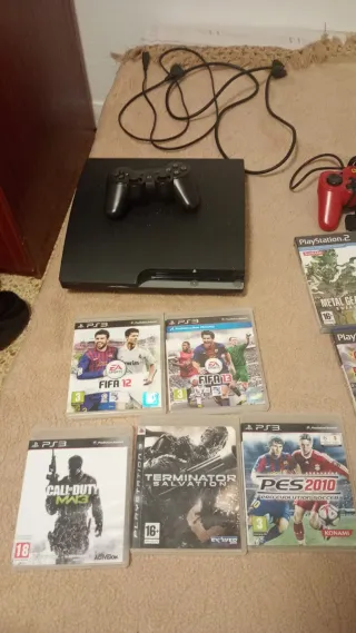Consola PlayStation 3 en color negro, acompañada de dos mandos (uno naranja y otro negro) y nueve videojuegos físicos. - Incluye dos mandos no originales. - Se incluyen 9 juegos en formato físico.