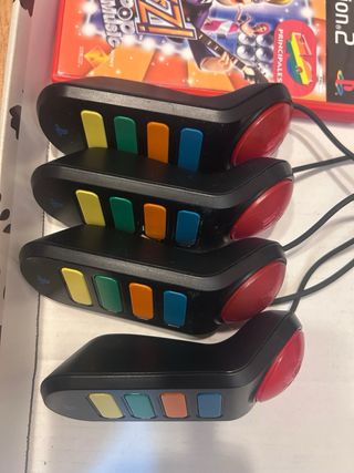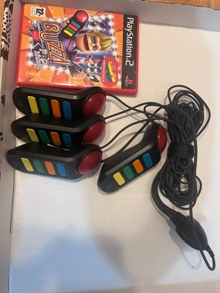 Pack de juego Buzz! Pop Music para PlayStation 2 junto con cuatro mandos. - Juego Buzz! Pop Music. - Cuatro mandos Buzz! con botones de colores (rojo, azul, verde, amarillo, naranja). - Mandos con cable.