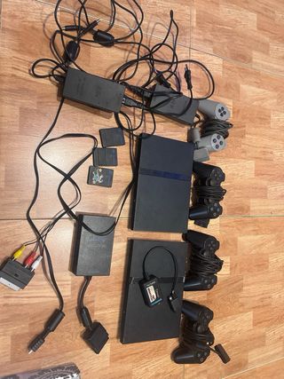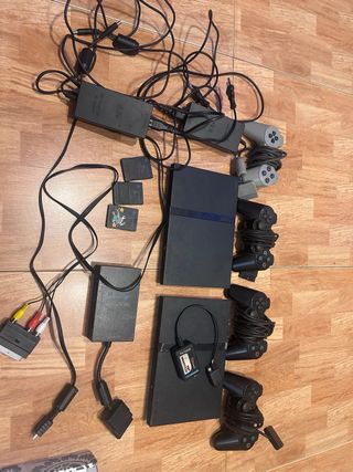 Lote de consolas PlayStation 2 en color negro. - Dos consolas PlayStation 2. - Múltiples mandos. - Varios juegos y tarjetas de memoria. - Adaptadores y cables de conexión.