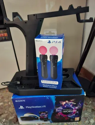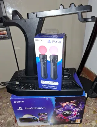 Lote de Realidad Virtual VR para PLAYSTATION 4, PS4, compuesto por: 2 mandos de movimiento; base soporte para la consola y las gafas RV; gafas de Realidad Virtual con cámara y 2 juegos. MIRA LA DESCRIPCIÓN DE LOS ARTICULOS EN SUS ANUNCIOS INDIVIDUALES EN MI PERFIL ANTES DE COMPRARLO, sobre todo el de las gafas, ya que tienen un problema con la espuma de la diadema. Lo de las fotos.