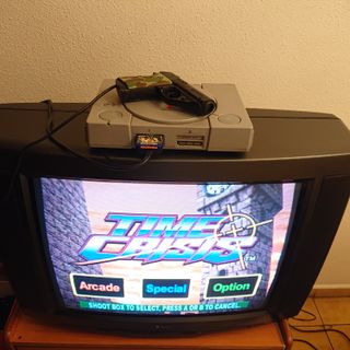 PlayStation con 1 mando, 1 pistola, 1 tarjeta de memoria, cables de corriente y video/audio, 7 juegos en CDr (repito: en CDr). Lee juegos pal y ntsc. Todo funcionando perfectamente como se muestra en las fotografias. Comprando la consola regalo Tv de tubo de 25 pulgadas, se necesita una tv de este tipo para que funcione la pistola. PRECIO FINAL