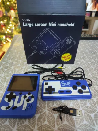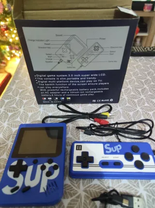 Consola de juegos portátil estilo retro. Incluye mando adicional y manual de usuario. Trae juegos de Mario Bros, Show Brother, contra...con un montón de juegos de toda la vida, cualquier duda preguntame. - Mando de control adicional. - Cable de carga. - Batería - Manual de usuario. - Cable para poder jugar también en la TV