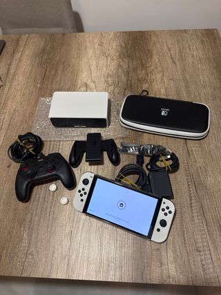Se vende consola Nintendo Switch en muy buen estado, es el modelo nuevo con pantalla OLED. Completa con todos sus accesorios, tal cual venía: Dock para Tv, Grip joycons, agarraderas, joycons originales blancos, y cables de carga Nintendo y HDMI. También incluyo funda, carcasa swich, fundas josticks y un mando pro de Game. Se puede ver y probar sin compromiso, el precio no es negociable.