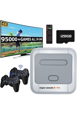 Consola de videojuegos Super console X-Pro con 95.000 juegos incluidos. Incluye tarjeta de memoria de 128GB y mando a distancia. Super Consola X-Pro Consola de Juegos Retro, Consolas de Videojuegos Retro de 128 G con más de 95,000 Juegos, Consola de emuladores, Andriod TV 7.1 y Sistemas de Juego para Salida 4K TV - Mando de control inalámbrico. - Tarjeta de memoria de 128GB. - Mando a distancia.
