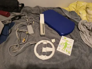 Consola Nintendo Wii (negra): Con base, sensor bar, cables AV (rojo, blanco, amarillo), adaptador de corriente y manuales/instrucciones. • Mandos y controles: 2 Wii Remotes (uno negro y uno azul), 2 Nunchuks, 1 Wii MotionPlus, y el mando extra de regalo. • Accesorios especiales: • Wii Balance Board (con caja de Wii Fit Plus). • Tableta uDraw con stylus (con caja de uDraw Studio: Instant Artist). • 2 Wii Wheels (volantes para Mario Kart). Juegos: New Super Mario Bros. Wii. Pictionary. Judy Dance 3. Just Dance 2014. Mario Kart Wii. Wii Fit Plus. uDraw Studio:Instant Artist. Wii Sports. Wii Sports resorts Juego zumba y cinturón.