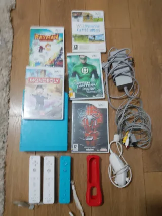 Consola Nintendo Wii en color azul, lista para horas de diversión. - Incluye los juegos: Wii Sports, Rayman Origins, Monopoly, Green Lantern y Spider-Man. - Viene con tres mandos Wii Remote, un Nunchuk. - Incluye cables de conexión y cargador.